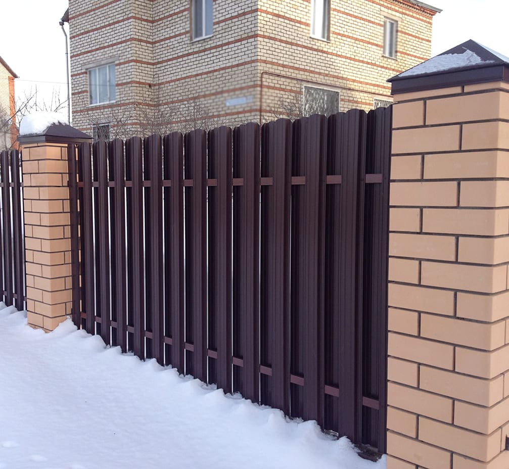 Заборы и ограждения из евроштакетника с кирпичными столбами 90 метров в Балабаново