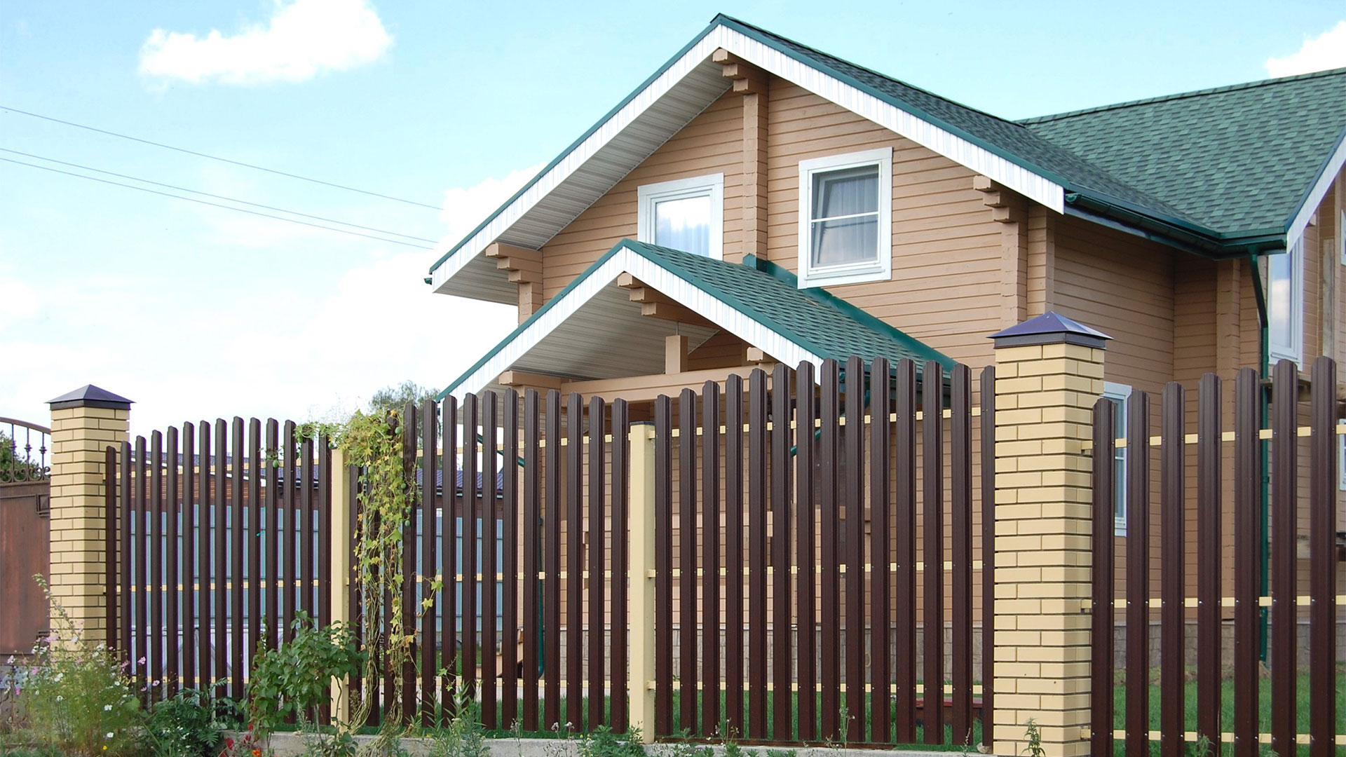 Заборы и ограждения из евроштакетника с кирпичными столбами 30 соток в Балабаново