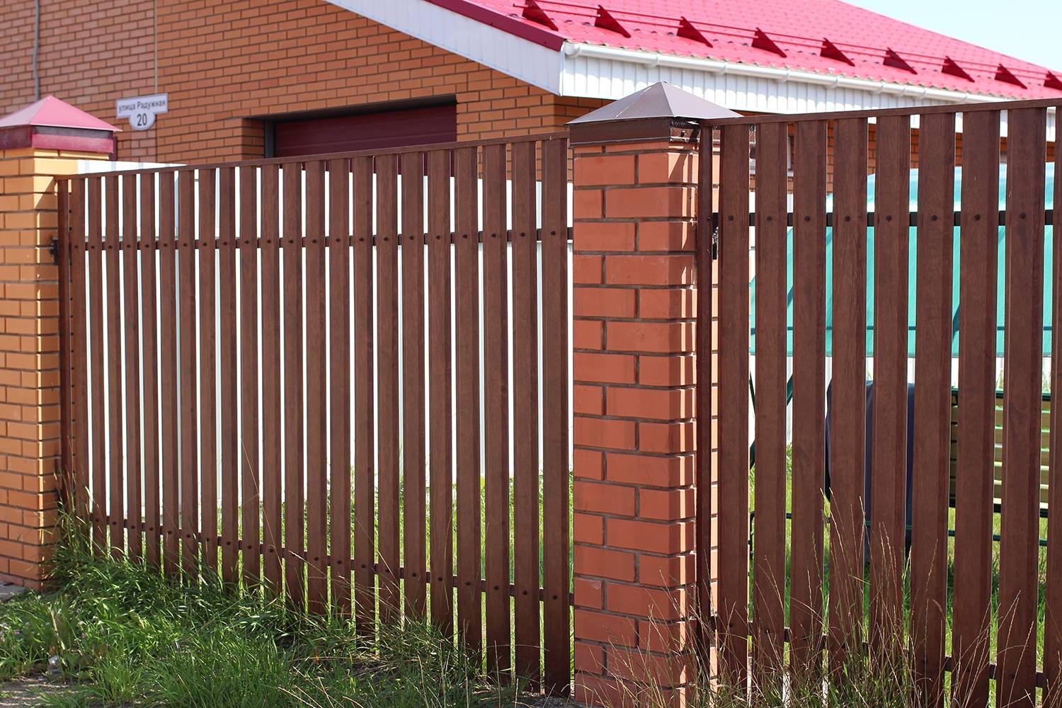 Заборы и ограждения из евроштакетника с кирпичными столбами 8 соток в Балабаново