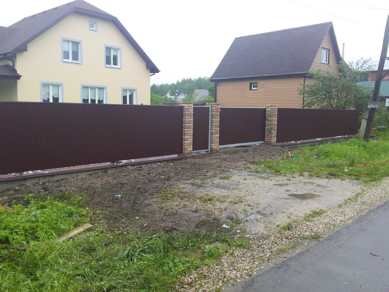 Заборы и ограждения из профнастила с кирпичными столбами 30 соток в Балабаново